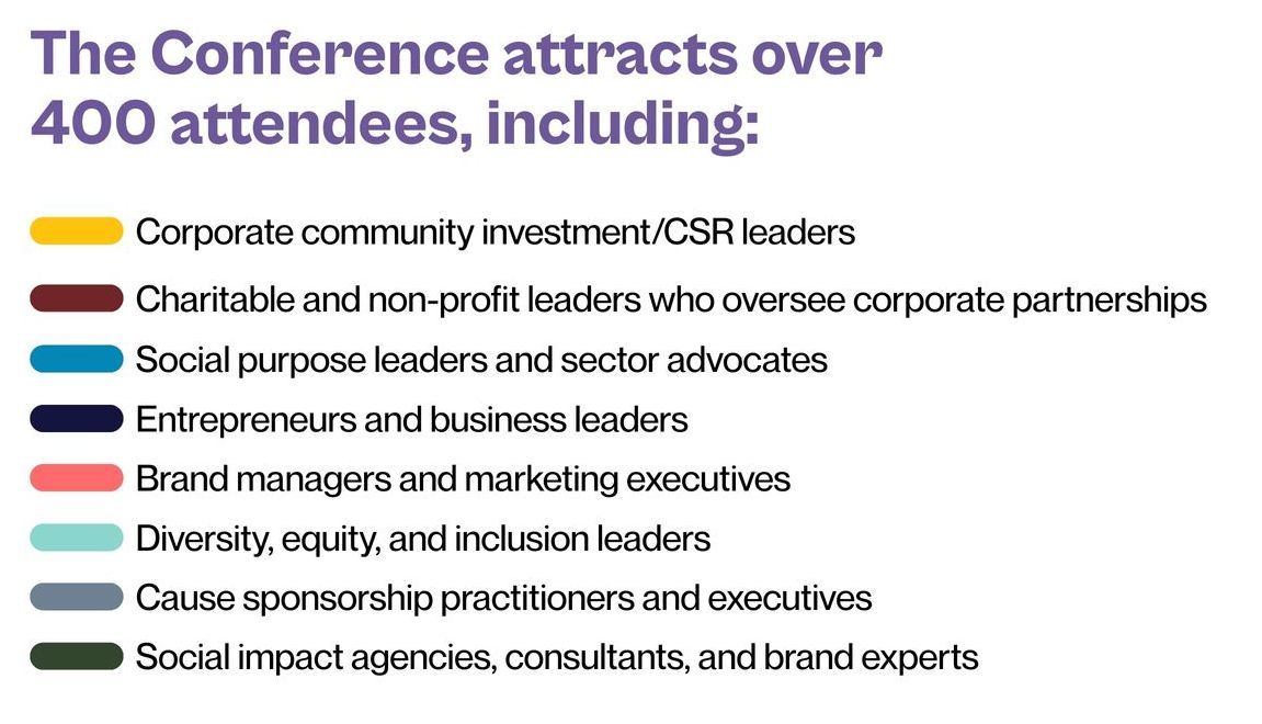 If you’re working in the social impact or social purpose space and want to learn more about partnerships and purpose, this conference is for you. We welcome organizations of all sizes — from nonprofits and charities to small businesses and large corporations — looking to connect, be inspired, and explore how purpose can drive meaningful change.